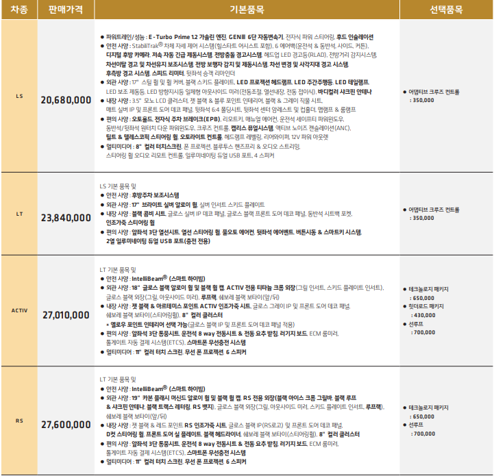 아래는 트랙스 크로스오버의 신차 가격표입니다.트랙스 크로스오버의 신차 가격은 LS 2068만원, LT 2384만원, 액티브 2701만원, RS는 2760만원입니다.