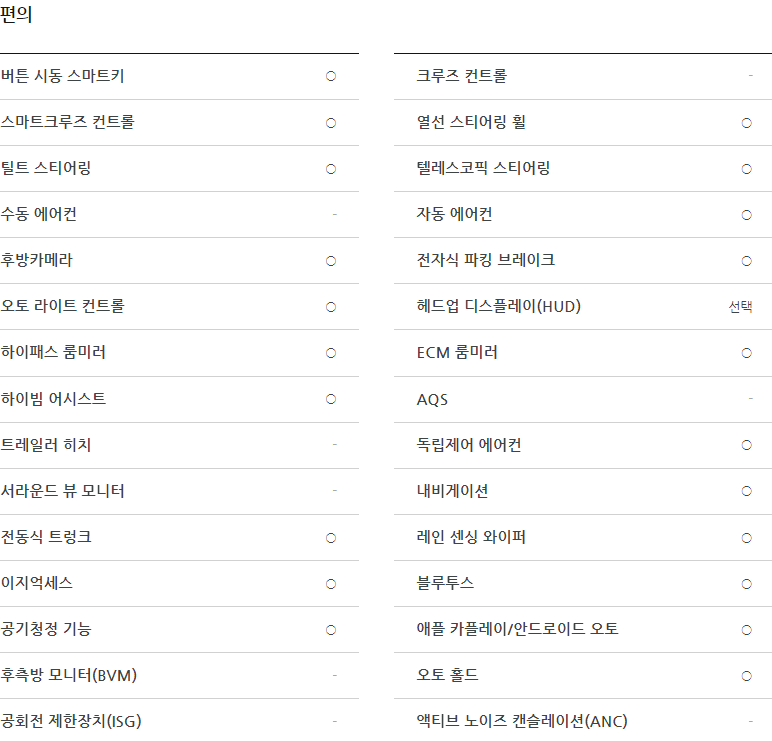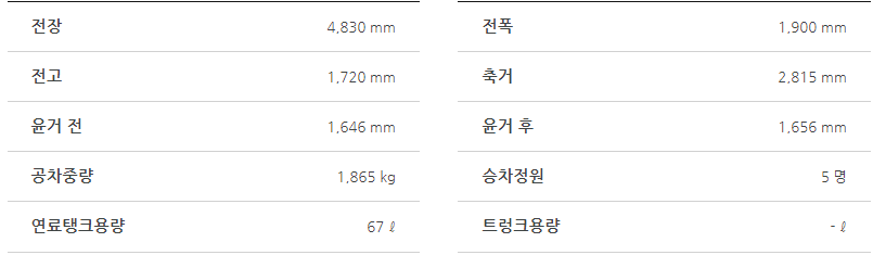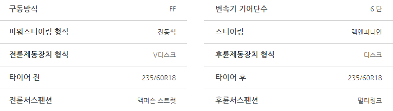 - 엔진: 가솔린, 디젤, 하이브리드 등 다양한 엔진 옵션을 제공하여 연비와 성능을 모두 만족시킵니다.