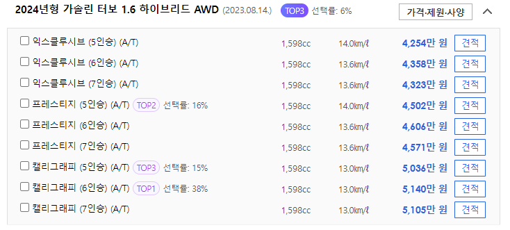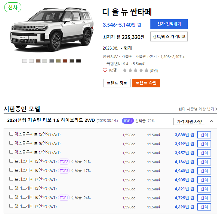 👇👇👇싼타페 하이브리드 경쟁차량 신차 정보👇👇👇