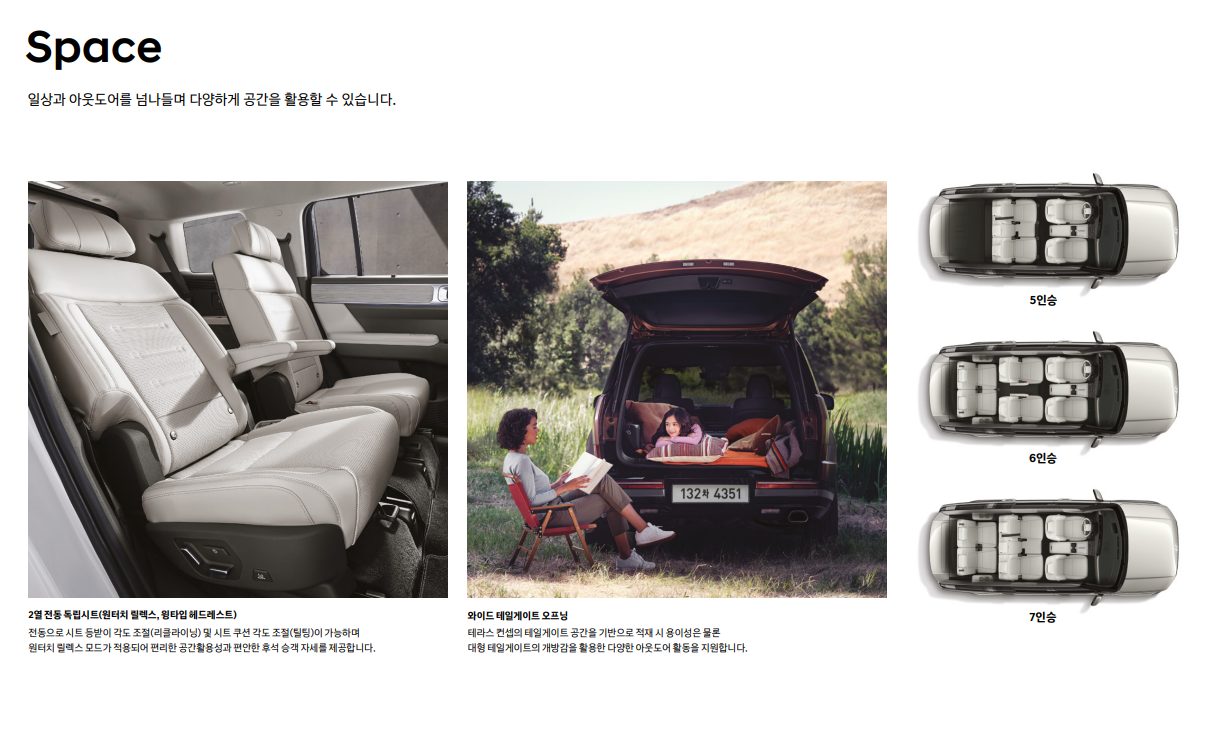 - 넓은 실내 공간: 넉넉한 2열과 3열 공간은 가족 단위 고객들에게 매력적입니다.