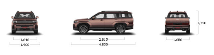 싼타페 하이브리드의 크기는 전장 4830mm, 전폭 1900mm, 전고 1720mm, 축거 2815mm입니다.