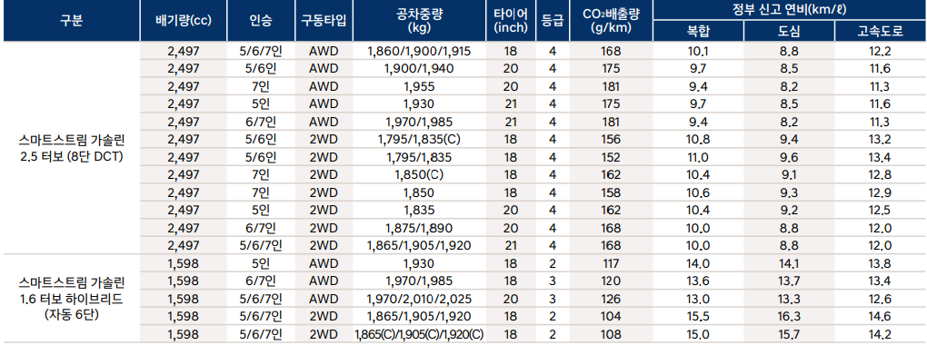 싼타페 하이브리드 연비 제원표