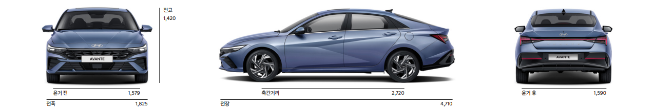 아반떼 하이브리드 크기는 전장 4710mm, 전폭 1825mm, 전고 1420mm, 축거 2720mm입니다.
