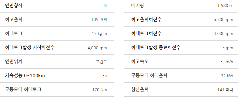 - 엔진: 1.6 GDI 엔진 + 전기 모터
