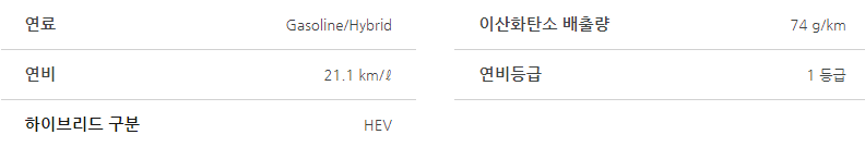 - 뛰어난 연비: 하이브리드 시스템을 통해 동급 모델 대비 월등히 높은 연비를 자랑합니다.