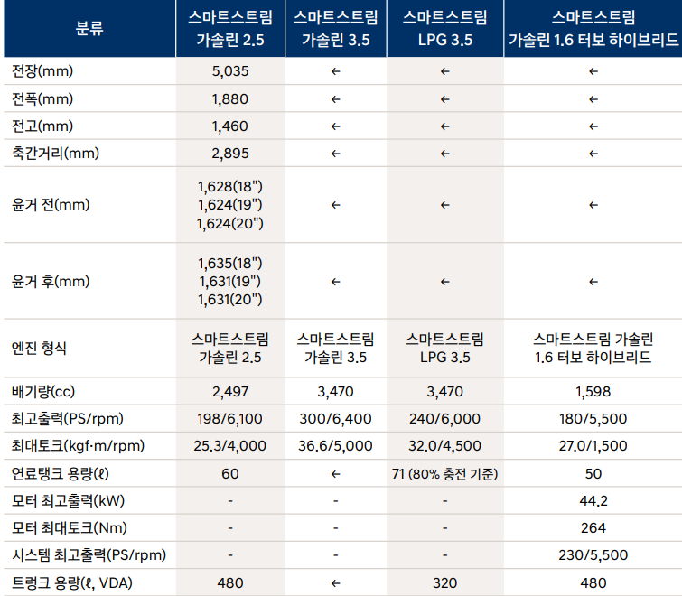 그랜저 하이브리드 제원표
