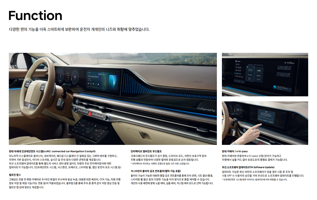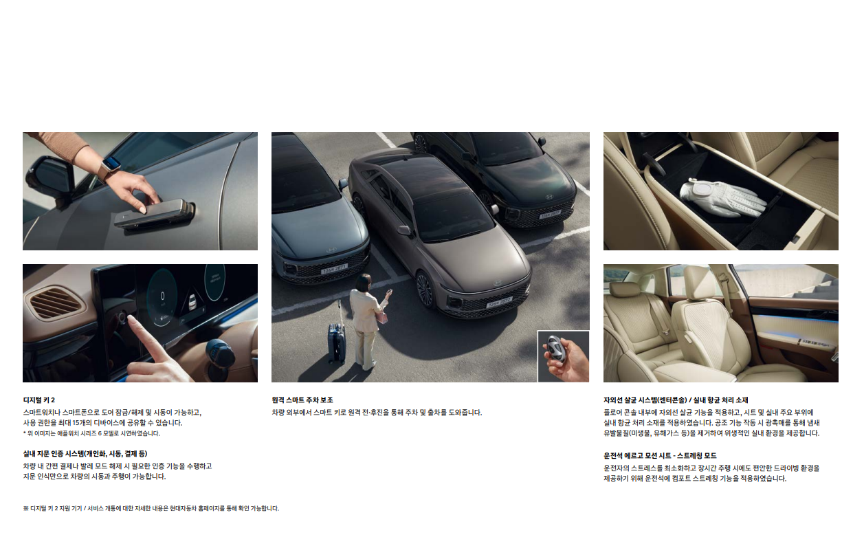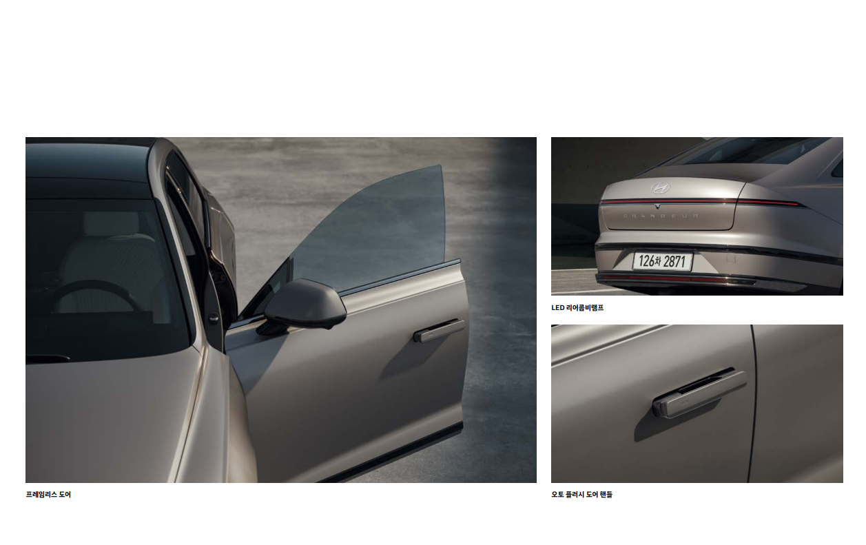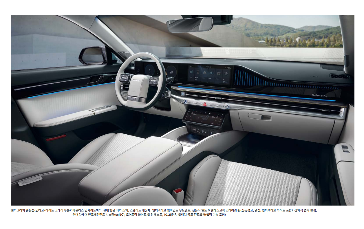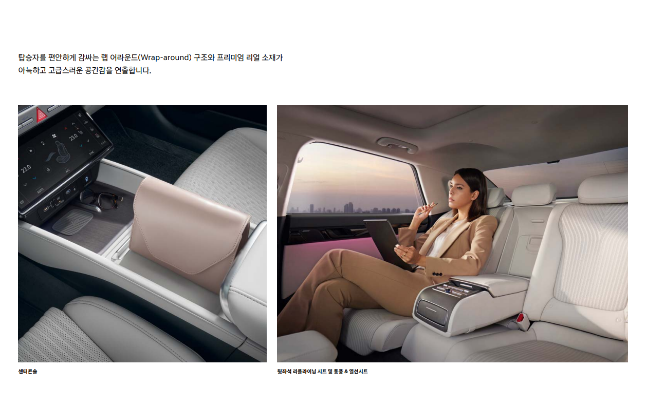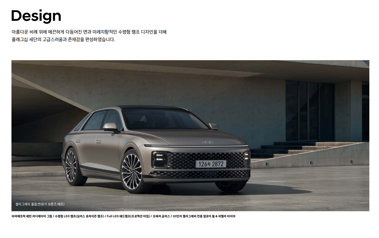 - 럭셔리한 디자인: 고급스러운 외관 디자인과 고급 소재를 사용한 실내 디자인으로 프리미엄 세단의 위상을 드높입니다.