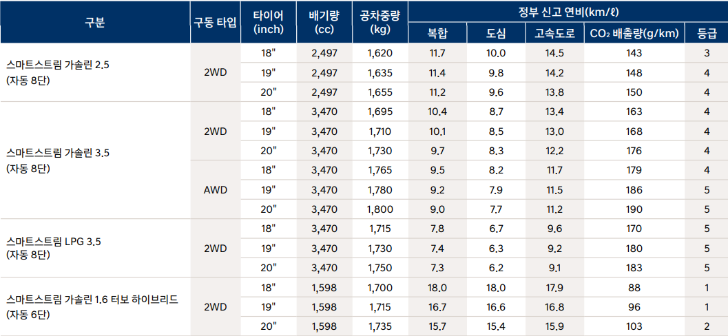 그랜저 하이브리드 연비 제원표