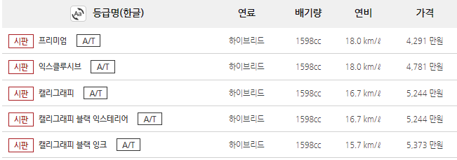 아래는 그랜저 하이브리드의 신차 가격표입니다. 그랜저 하이브리드의 신차 가격은 4291 ~ 5373만 원입니다.