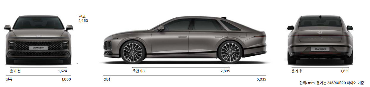그랜저 하이브리드의 크기는 전장 5035mm, 전폭 1880mm, 전고 1460mm, 축거 2895mm입니다.