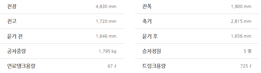 아래는 싼타페의 제원표입니다. 차량의 성능에 대해서 상세하게 알아보도록 하겠습니다.