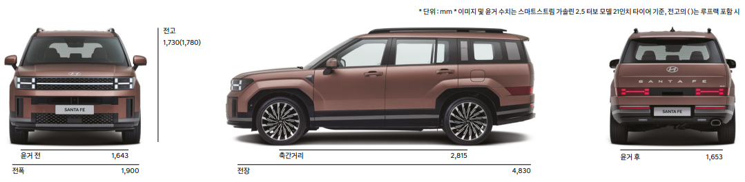 싼타페의 크기는 전장 4830mm, 전폭 1900mm, 전고 1720~1730mm, 축거 2815mm입니다.