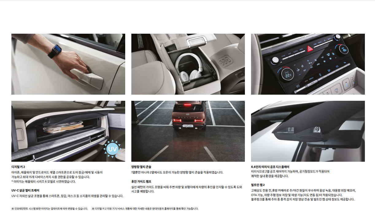 - 편의 기능: 뒷좌석 좌석 조절, 파워 테일게이트, 무선 충전 등 다양한 편의 기능을 통해 편리한 운전을 지원합니다.